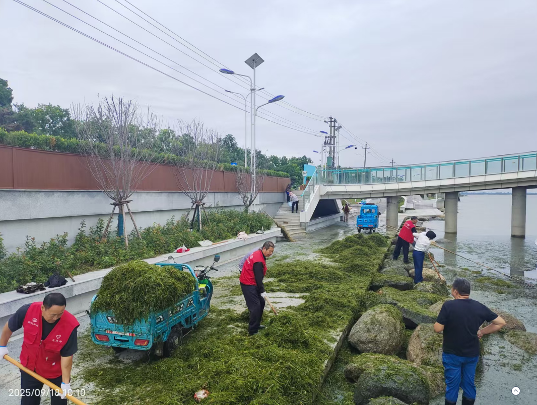 20名“红马甲”在七堡取水头部集结。党员突击队佩戴党员徽章、亮身份,率先跳入滩涂;苏诺公司志愿者驾驶三轮车同步跟进。大家排成“一字网”推进,铁锹、钉耙、夹子齐上阵,连根铲起成堆水草,逐一分拣夹杂的塑料瓶、渔网、泡沫板。一上午连续作业,共清理垃圾60余车、约3吨,全部运至指定地点,岸线瞬间恢复“无痕”面貌。